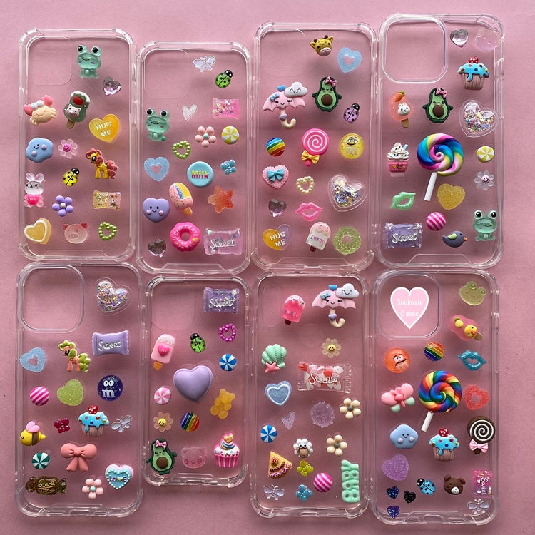 Transparent acrylic case decorated with figures glued with resin, it has anti-shock edges that cover the 4 sides of the phone and 13 figures to choose from.