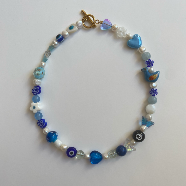 Necklace made with glass and ceramic charms, natural pearls and gold-plated stainless steel clasp. Measure 36cm.