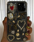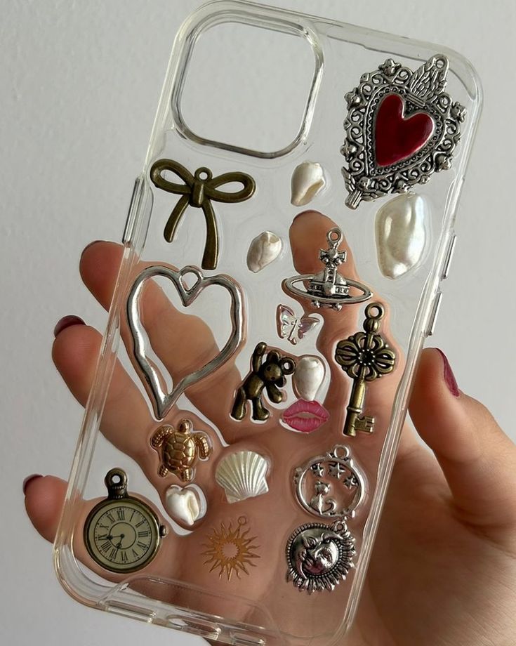 • Case de acrílico transparente decorado con charms vintage incrustados con resina.