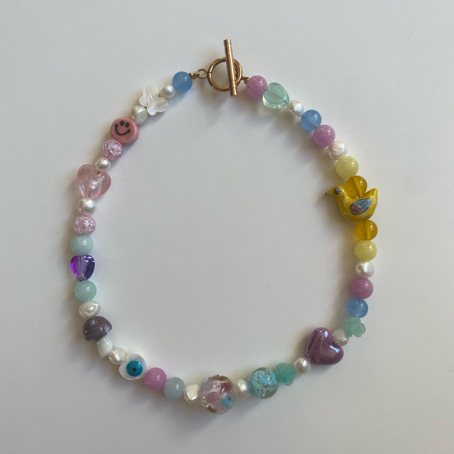 Collar hecho con dijes de vidrio y cerámica, perlas naturales y broche de acero inoxidable bañado en oro. Medida 36cm.