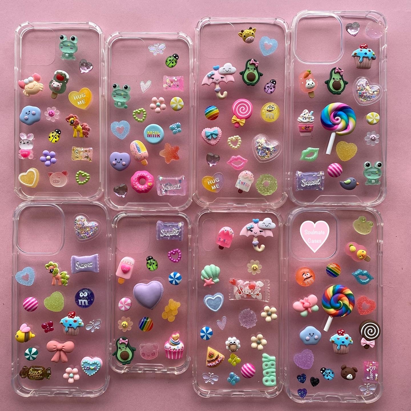 Case de acrílico transparente decorado con figuras pegadas con resina, tiene bordes anti shock que cubren los 4 lados del teléfono y 13 figuras a escoger.